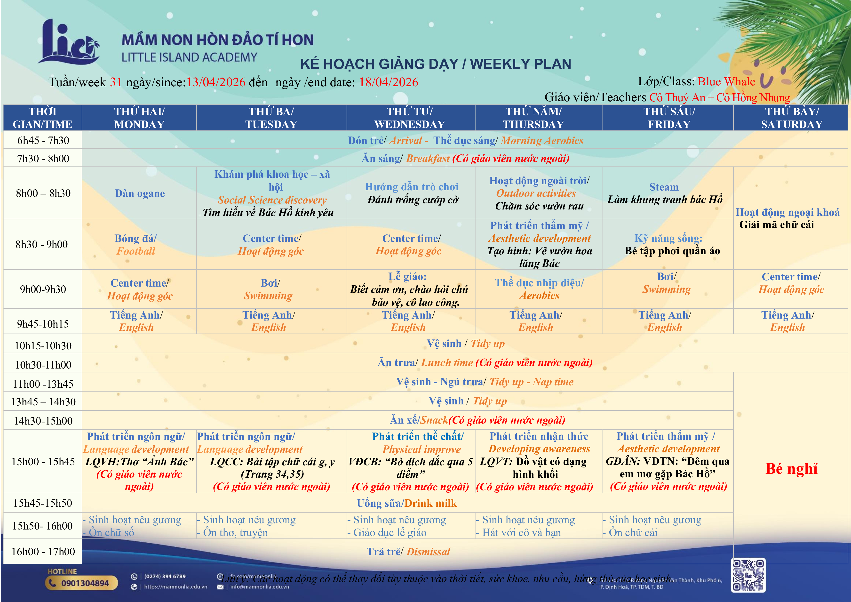 Kế hoạch giảng dạy lớp BlueWhale Tuần 03 Tháng 04