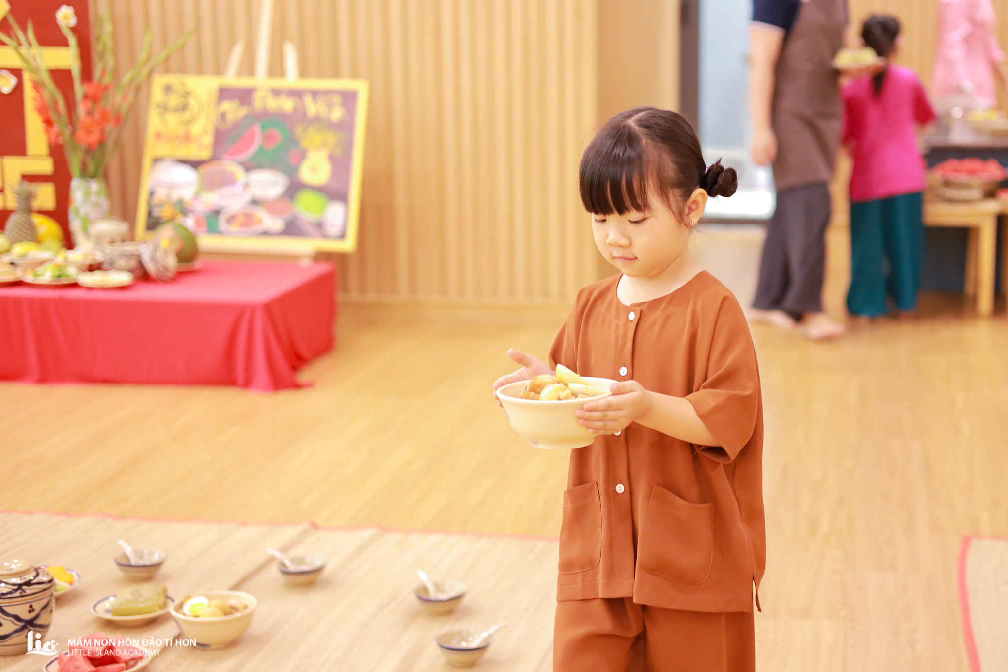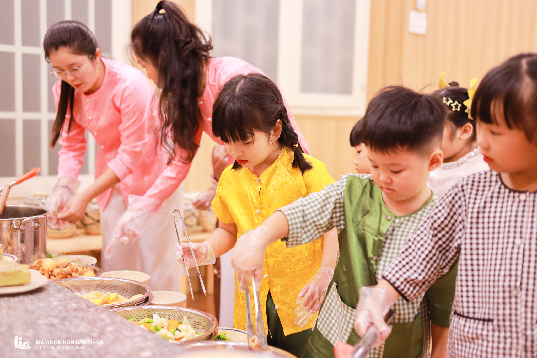 Ngay từ sáng sớm, các bé đã háo hức cùng cô giáo chuẩn bị cho bữa cơm đặc biệt của mình. Dưới sự hướng dẫn nhẹ nhàng và kiên nhẫn của các cô, các con được tham gia vào từng công đoạn quen thuộc trong không khí Tết truyền thống: